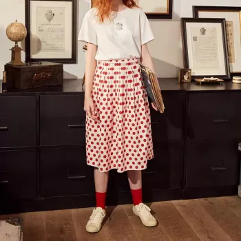 Women’s Polka Dot A-line Cotton Skirt with Elastic Waist and Button Decoration